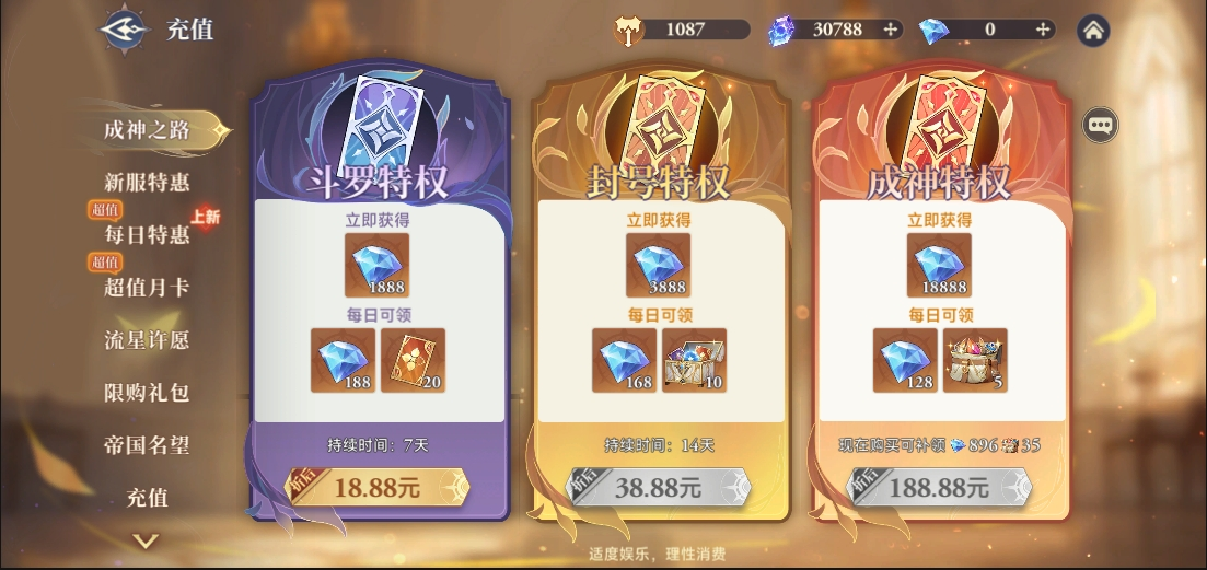 1000 :双月卡 + 成神之路18.88元+成神之路38.88元+成神之路188.88元+每日特惠 +每日7元代金+每日6.88元+9.88元+16.88元档位钻石+新服特惠