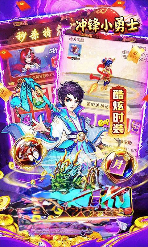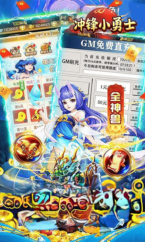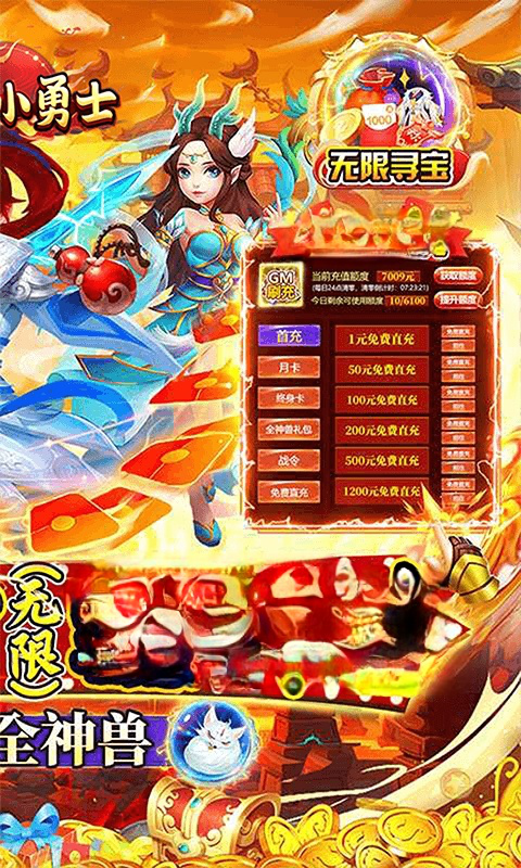 超人气西游回合题材手游《冲锋小勇士》带着超级福利来袭了,绝对是你以往没有体验过的快乐。开局满V,8888888元宝,888万银两,海量材料,限定称号称号*1。特色GM刷充,上线送超强打金工具,打怪爆免单券,不花一分钱也能当大佬,全神兽礼包,一包烟钱即可获得满神兽。你将生处妖魔纵横之乱世,开启热血的诛妖之路,参与征伐纣王的旷世之战。感受人、仙、魔三界魅力,斗天地镇众妖,开启属于你的封神传说。