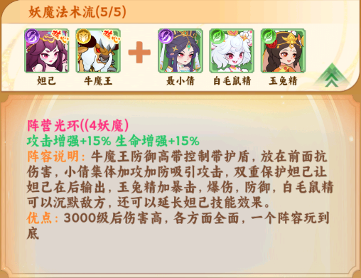 阵容说明:牛魔王防御高带控制带护盾,放在前面抗伤害,小倩集体加攻加防吸引攻击,双重保护姐已让妲已在后输出,玉免精加暴击,爆伤,防御,白毛鼠精可以沉默敌方,还可以延长姐已技能效果。优点:3000级后伤害高,各方面全面,一个阵容玩到底。